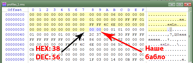 3. Теперь запускаем наш RMS-редактор и находим файлик profiles_1. Открываем его. Я буду показывать всё на примере с WinHex, но подойдёт любой 16-ричный редактор.